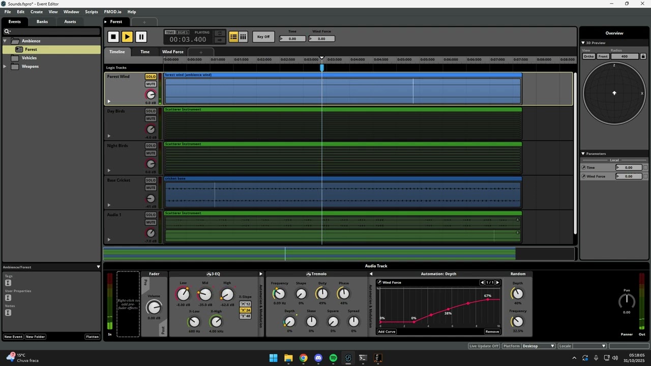 But I followed your advice: I imported more wind sounds into the project and then customized it as needed. Including wind sounds for the trees, which I’ll place in each tree in the game, varying the audio or effect according to their size.