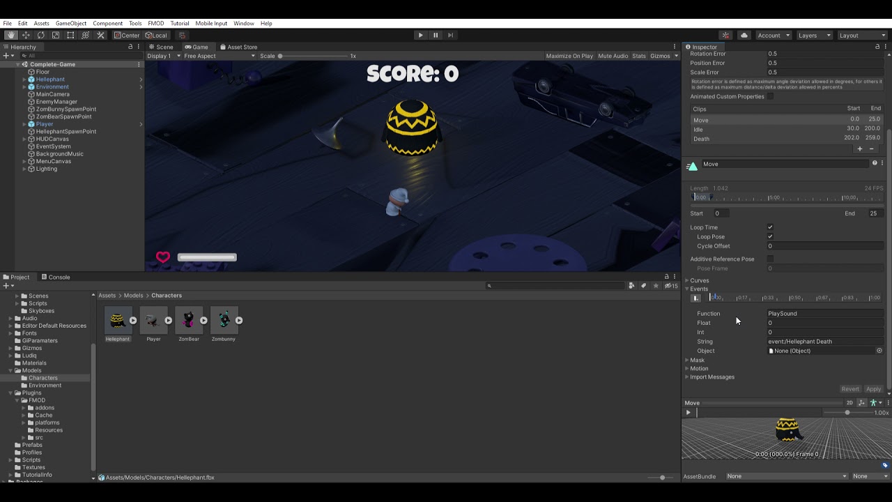 After some experimentation, I’ve discovered that a PlaySound event attached to the Hellephant’s death animation won’t play if it’s too close to the start of the animation. If you place the event at around 0:20 or later in the death animation, the FMOD Studio event will play.